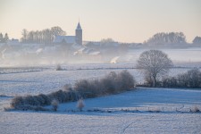 Kerk van Hemelveerdegem in de ochtendmist