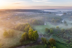 De Scheldevallei ter hoogte van Zingem op een mistige najaarsochtend gezien vanuit de lucht.