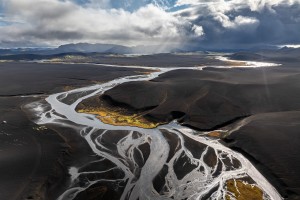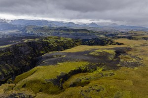 Luchtfoto van het vulkanische landschap in het binnenland van IJsland. De iconische Maelifell rijst op uit de uitgestrekte aswoestijn van Mælifellssandur, omringd door bergen, rotsen en dreigende wolken