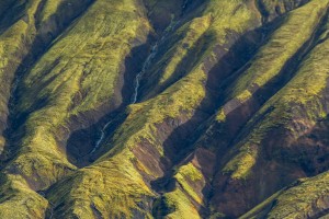 Luchtfoto van het vulkanische landschap in het binnenland van IJsland. De iconische Maelifell rijst op uit de uitgestrekte aswoestijn van Mælifellssandur, omringd door bergen, rotsen en dreigende wolken