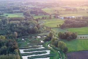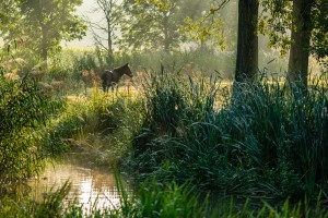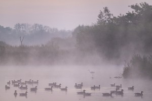 Een Lepelaar zit temidden van één van de vijvers in natuurgebied De Luysen op een mistige najaarsochtend.