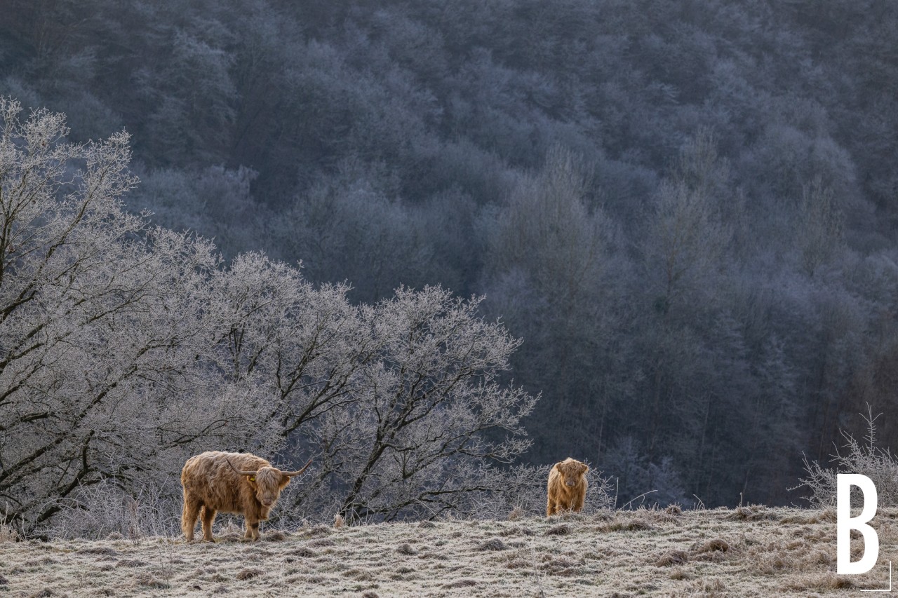 Schotse Hooglander grazend in een winters landschap bedekt met vorst.