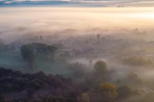 Luchtfoto van het Hayesbos gehuld in dichte ochtendmist tijdens de herfst.