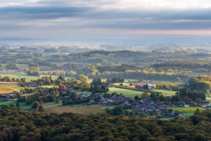 Besneeuwde kruinen van het Kluisbos in de Vlaamse Ardennen, vastgelegd vanuit de lucht tijdens de winterprik.