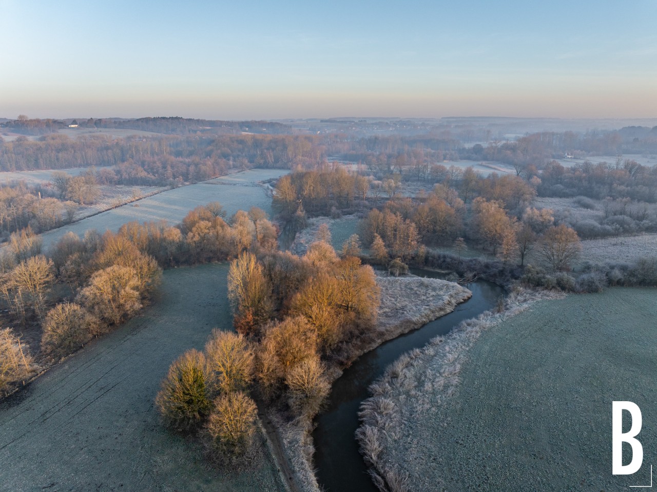Dronefoto van de riviervallei van de dijle in de mist tijdens een winterse ochtend te oud-heverlee.
