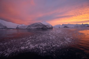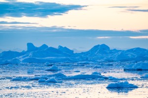 Droneopname van de witte ijsmassa's in de diepblauwe oceaan.