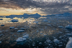Een walvis duikt op tussen de drijvende ijsschotsen.