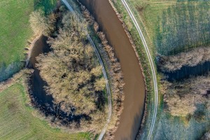 Dronefoto van de kronkelende rivier de dijle tijdens de winter in de omgeving van hever.