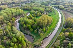 Luchtfoto van de meanderende Demer bij avondrood.