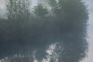 Zicht op de kerk van Grimminge en de meersen gehuld in ochtendnevel.