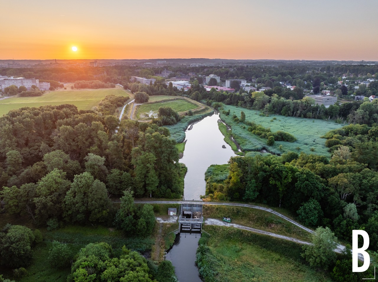 De eerste zonnestralen vallen over het wachtbekken en de Dijle.