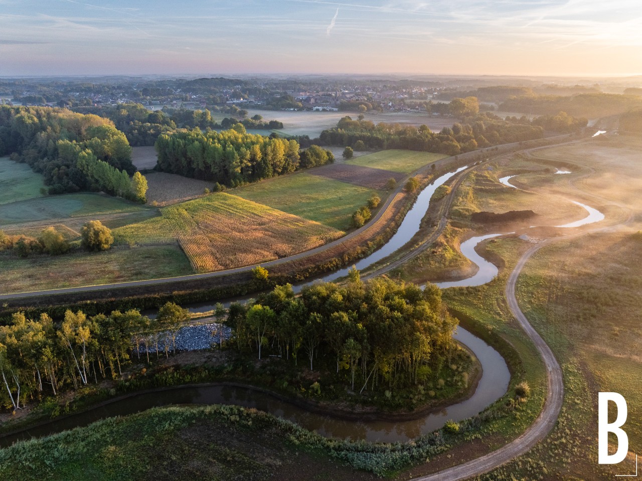 Luchtfoto van de nieuwe rivierbochten onder een dik pak herfstmist.