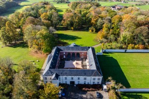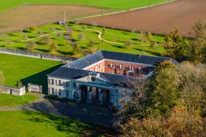 Droneopname van het historische kasteel en de omliggende tuinen in volle herfstkleur.
