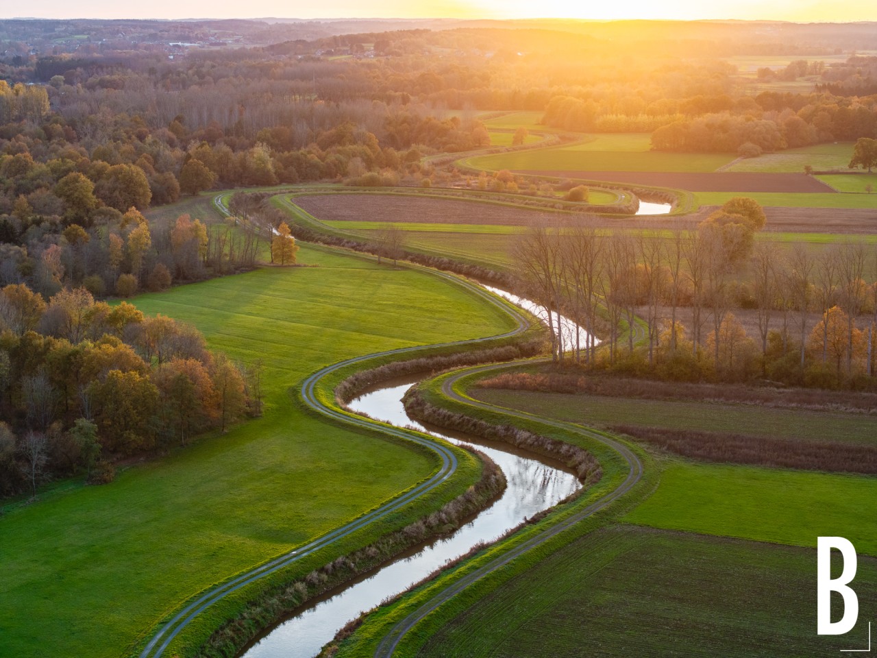 Dronebeeld van de bochtige rivier in de Demervallei tijdens een sfeervolle zonsondergang.