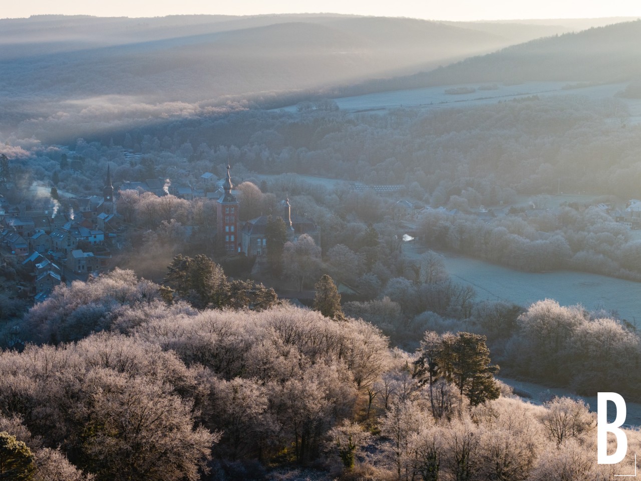 Luchtfoto van het besneeuwde of berijmde dorp en de omliggende heuvels tijdens de ochtend.