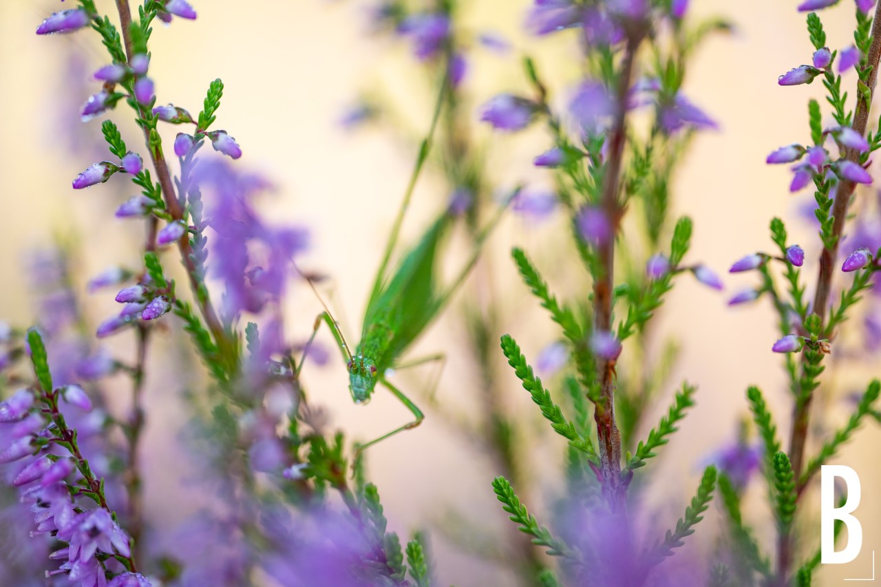 Een Sikkelsprinkhaan verbergt zich tussen de bloeiende struikheide.