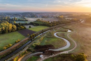 Luchtopname van de Demervallei gehuld in een maagdelijk witte laag sneeuw.