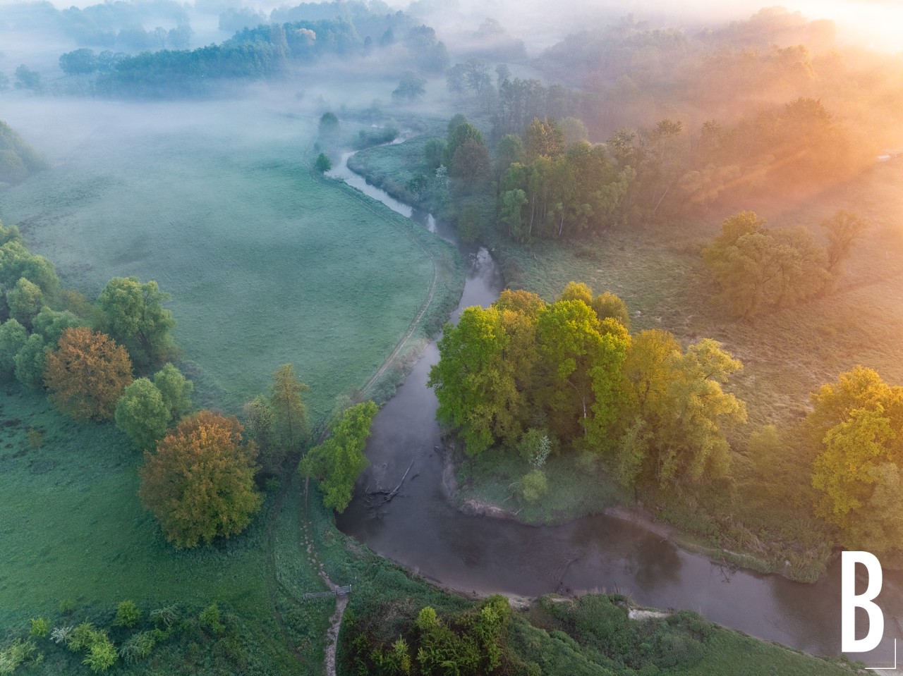 HDR-luchtbeeld van de kleurrijke lucht boven de mistige Doode Bemde.
