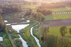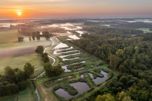 Natuurgebied De Luysen met haar talrijke vijvers gezien vanuit de lucht op een mooie avond in de late zomer.