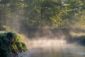 Zicht op de bomen in de Doode Bemde gehuld in een mysterieuze mist.