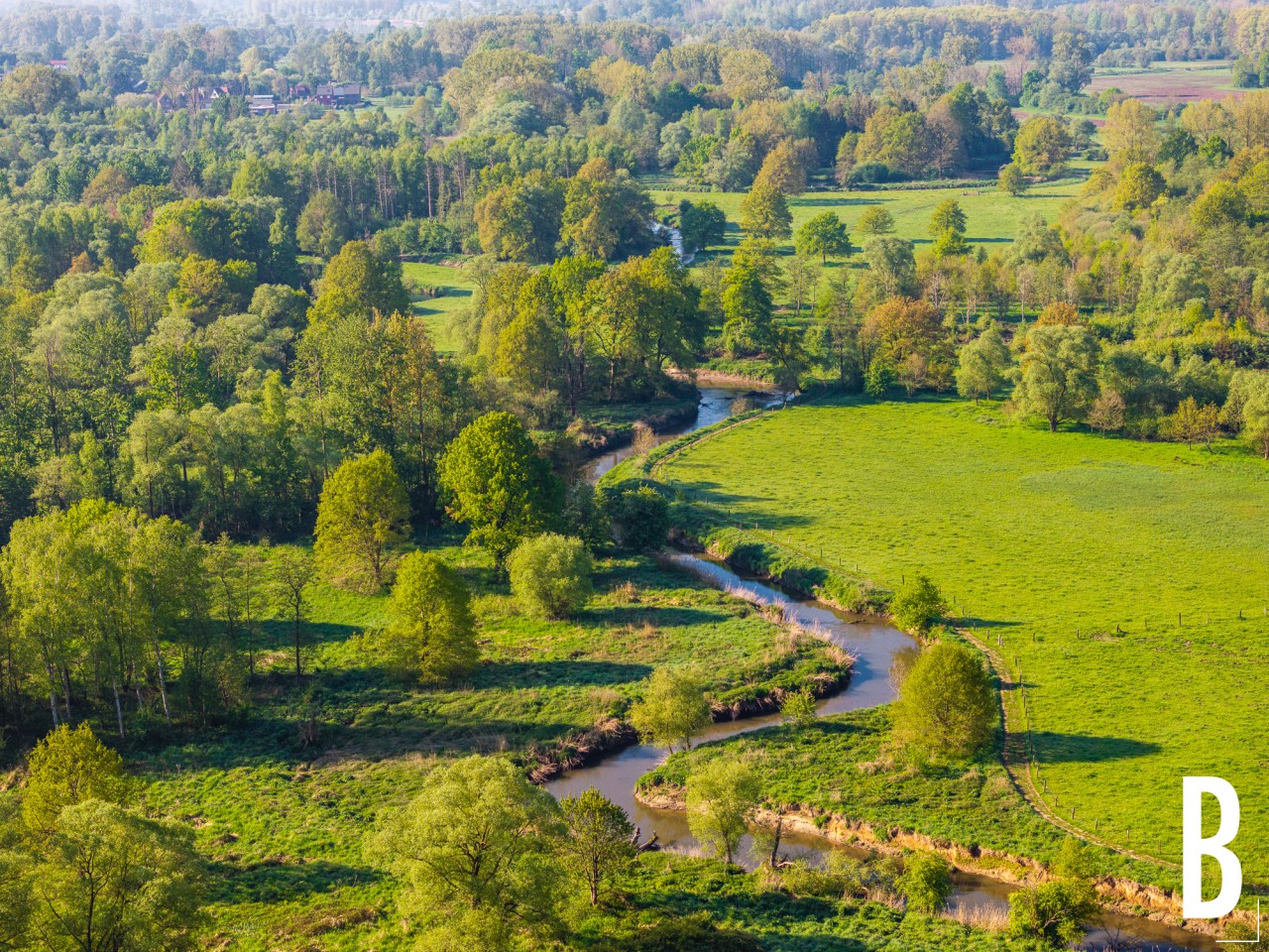 Dronebeeld van de kronkelende Dijle die door de Doode Bemde meandert.