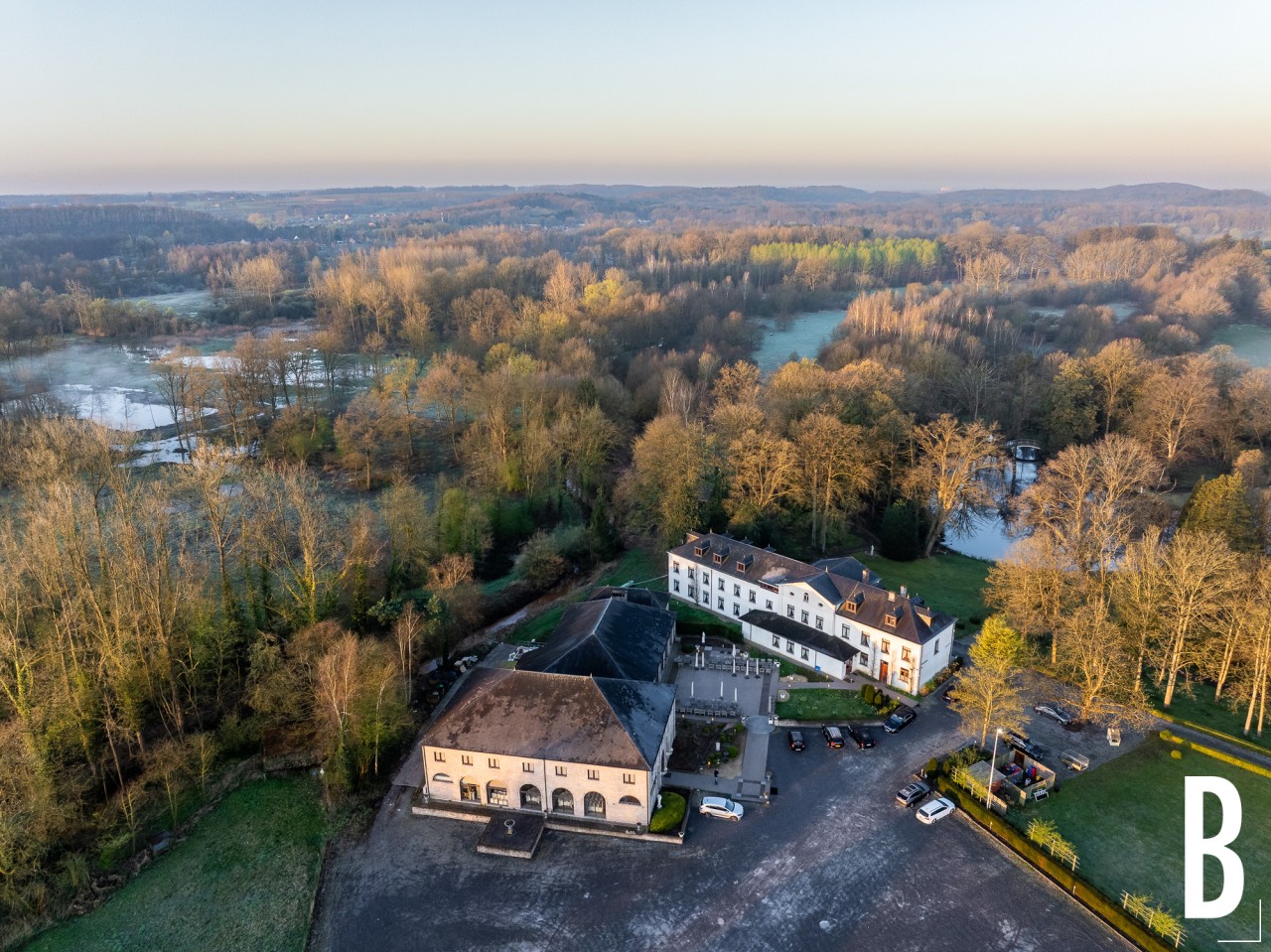 Luchtfoto van het kasteel van nieuwland in de mist tijdens de ochtend te betekom.