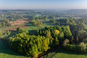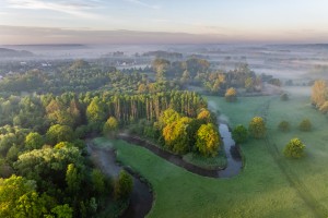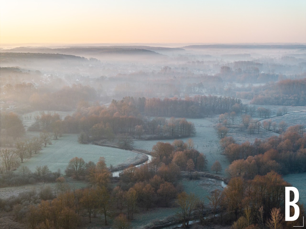 Dronefoto van de riviervallei van de dijle in de mist tijdens een winterse ochtend te oud-heverlee.