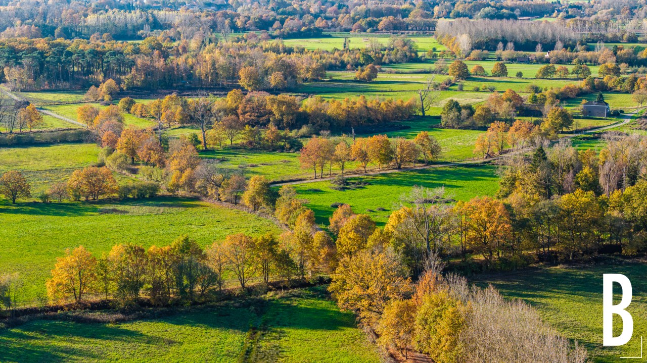 Dronebeeld van de herfstige meersen en de Dijlevallei in Bonheiden.