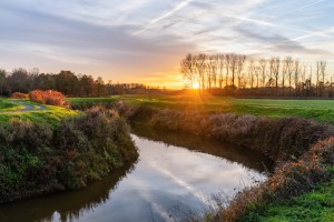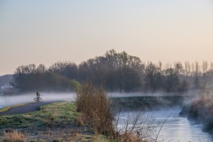 De kronkelende patronen van de Demer worden geaccentueerd door de sneeuw in dit dronebeeld boven Testelt.
