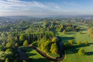 Zicht op de dijlevallei met ochtendmist en rijp tijdens de winter in natuurreservaat doode bemde te oud-heverlee.
