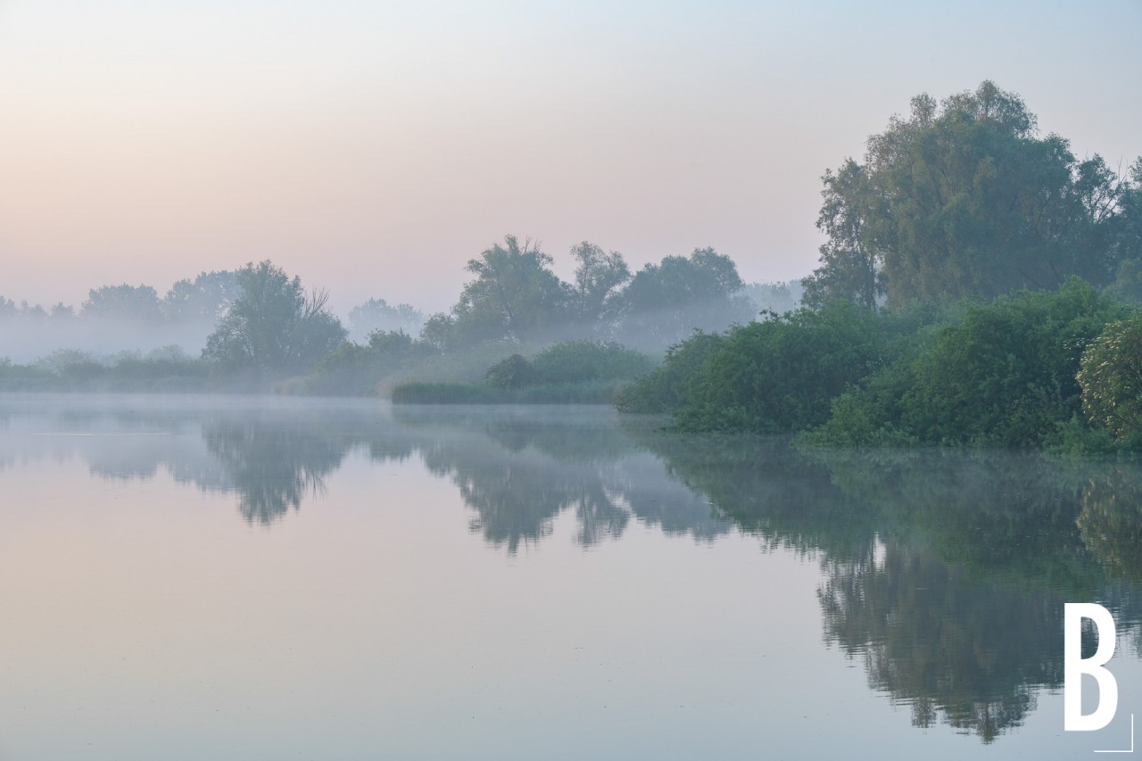 Weerspiegelingen van oevervegetatie en mist in het kalme water van de Durme