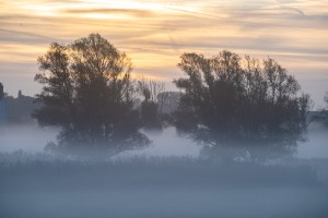 Natuurreservaat de Langemeersen gezien vanuit de lucht op een mistige septemberochtend.