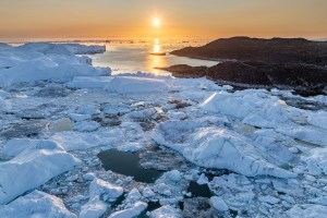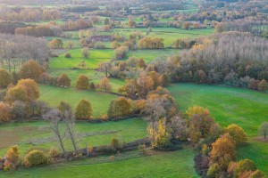 Luchtfoto van de verkleurende boomkruinen van Bos 't Ename bij zonsondergang.