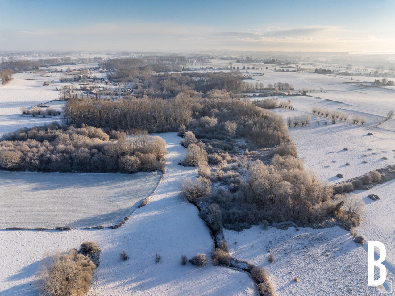 Luchtbeeld van het rijpwitte natuurreservaat Moenebroek tijdens een ijskoude ochtend.