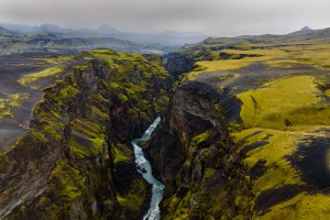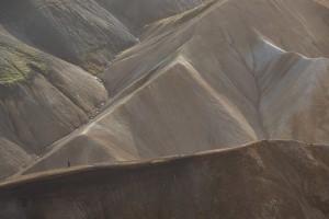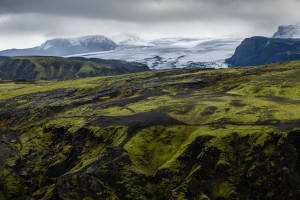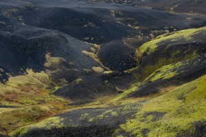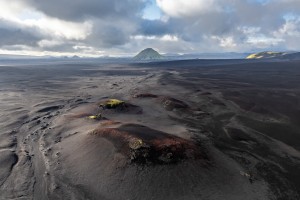 De blauwe lucht reflecteert in het drijfzand in de aswoestijn van Veidivatn. Een conische berg steekt boven het zwarte landschap uit.