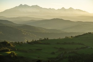 Zicht op de beboste heuvels en besneeuwde bergtoppen van het Tatra-gebergte.