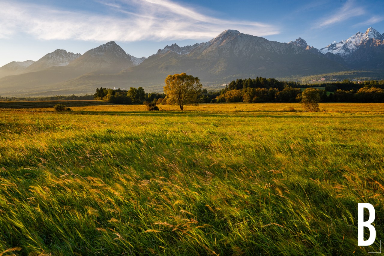 Een eenzame boom in het veld met de toppen van de Hoge Tatra op de achtergrond.