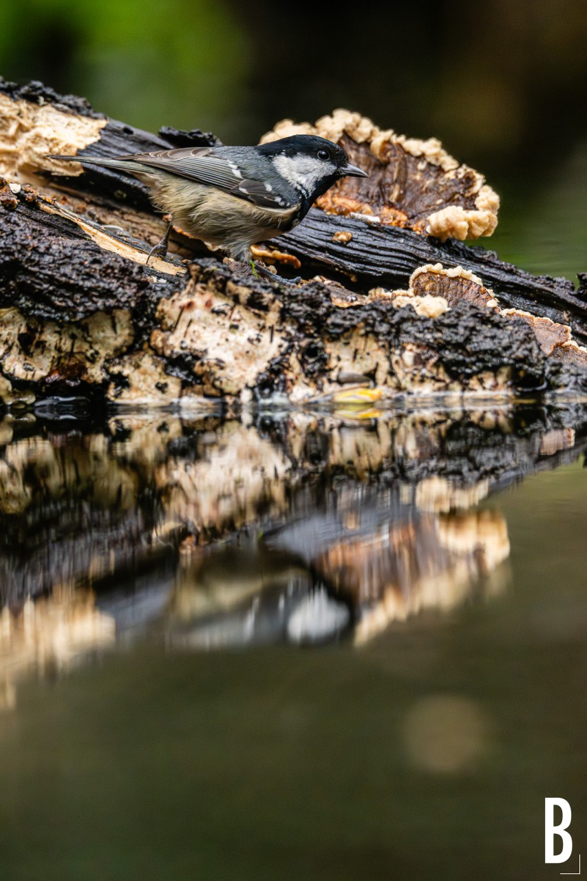Een zwarte mees (Periparus ater) rustend op een tak in het besneeuwde bos.