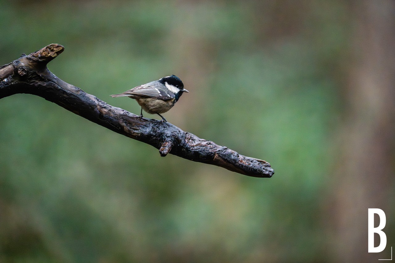 Close-up van een zwarte mees (Periparus ater) zittend op een tak.