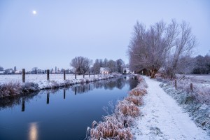 Verstild winterbeeld van knotwilgen langs de Zwalmbeek in Munkzwalm tijdens het ochtendgloren.