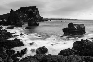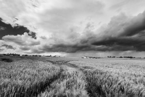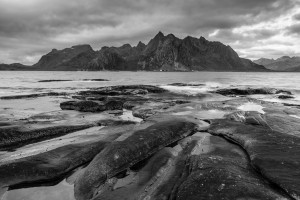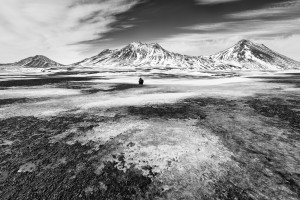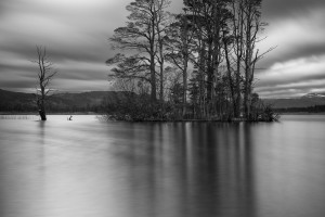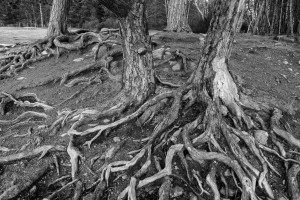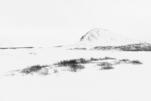 Zwart-wit beeld van bijzonder gevormde dennen met dode takken op de grond in de sneeuw in de Hoge Venen