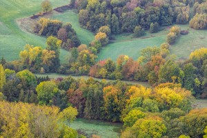 Dorp in een heuvellandschap met mistflarden tijdens de herfst