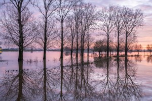 Bomen en kerk reflecteren in het water van de volvoput in de Scheldemeersen van Eine op een mistige ochtend in het voorjaar.