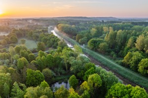 Natuurreservaat de Grootmeers op een mistige ochtend in het voorjaar gezien vanuit de lucht.