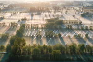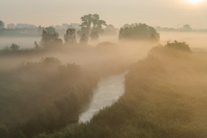 Mist hangt boven de moerassen en rietvelden van natuurreservaat de Blankaart op een ochtend in het late voorjaar.