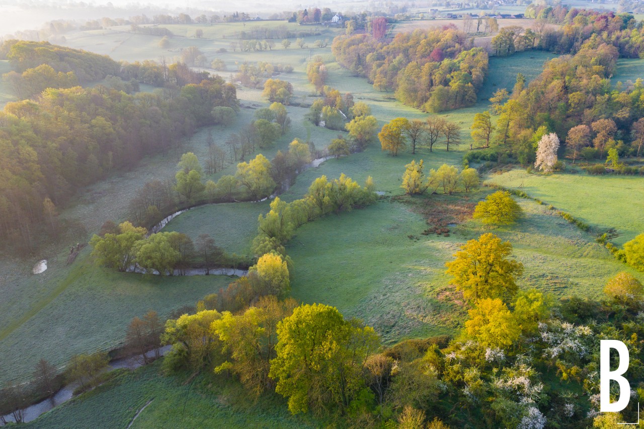 De vallei van de Geul op een nevelige lenteochtend gezien vanuit de lucht