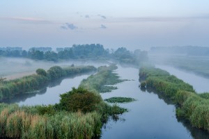 Natuurgebied de Kruibeekse polder met grachten, vijvers en dode bomen op een mistige voorjaarsochtend gezien vanuit de lucht.