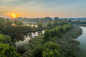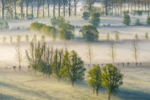 Natuurgebied de Kruibeekse polder met grachten, vijvers en dode bomen op een mistige voorjaarsochtend gezien vanuit de lucht.