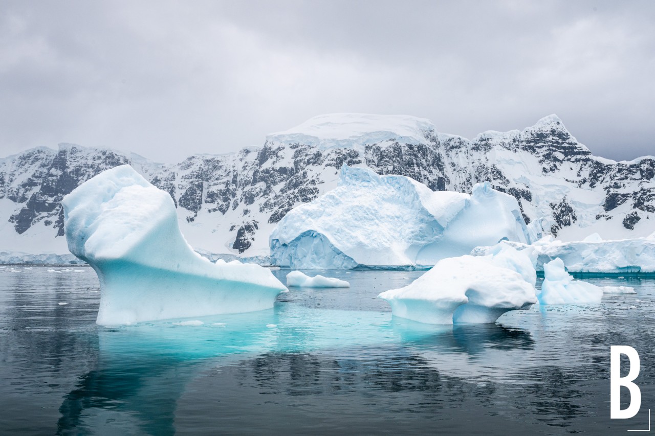 Gigantische ijsbergen drijven in het water voor imposante, met sneeuw bedekte bergen in Antarctica. De lucht is bewolkt, wat een mystieke sfeer creëert in deze ongerepte omgeving.