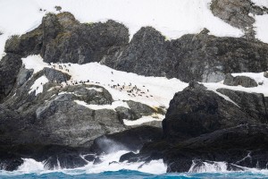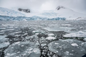 Een prachtig uitzicht op massieve besneeuwde bergen die oprijzen uit een ijzige oceaan, met drijvende ijsschotsen en een grijze lucht die de winterse sfeer versterkt.